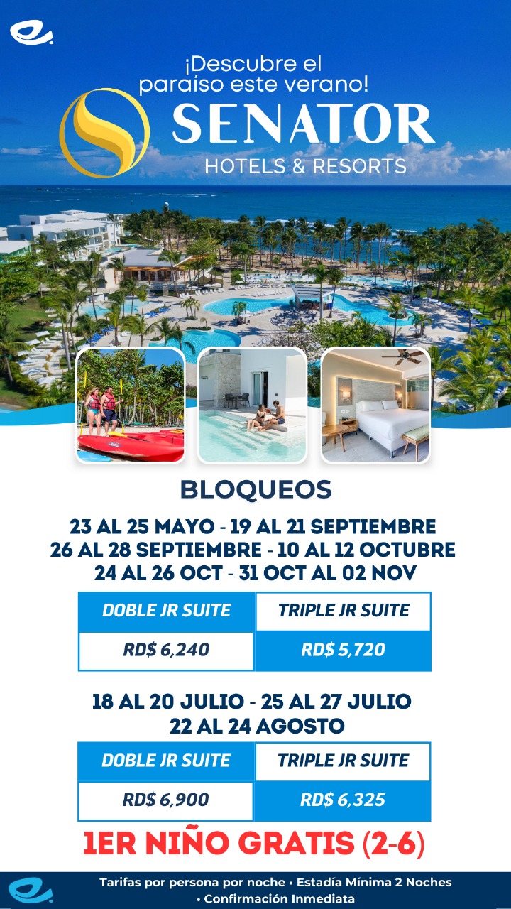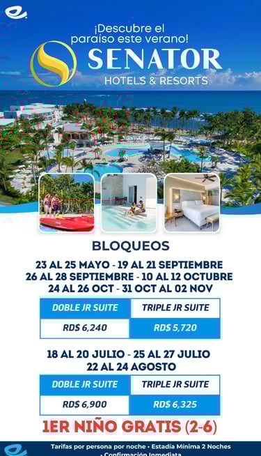 ¡Sumérgete en la belleza tropical de un verdadero paraíso este verano! Senator Hotels & Resorts te invita a disfrutar de unas vacaciones inolvidables en un entorno exótico, con playas paradisíacas, piscinas relajantes y servicios de lujo. Prepárate para vivir una experiencia única donde el relax y la diversión se combinan perfectamente.