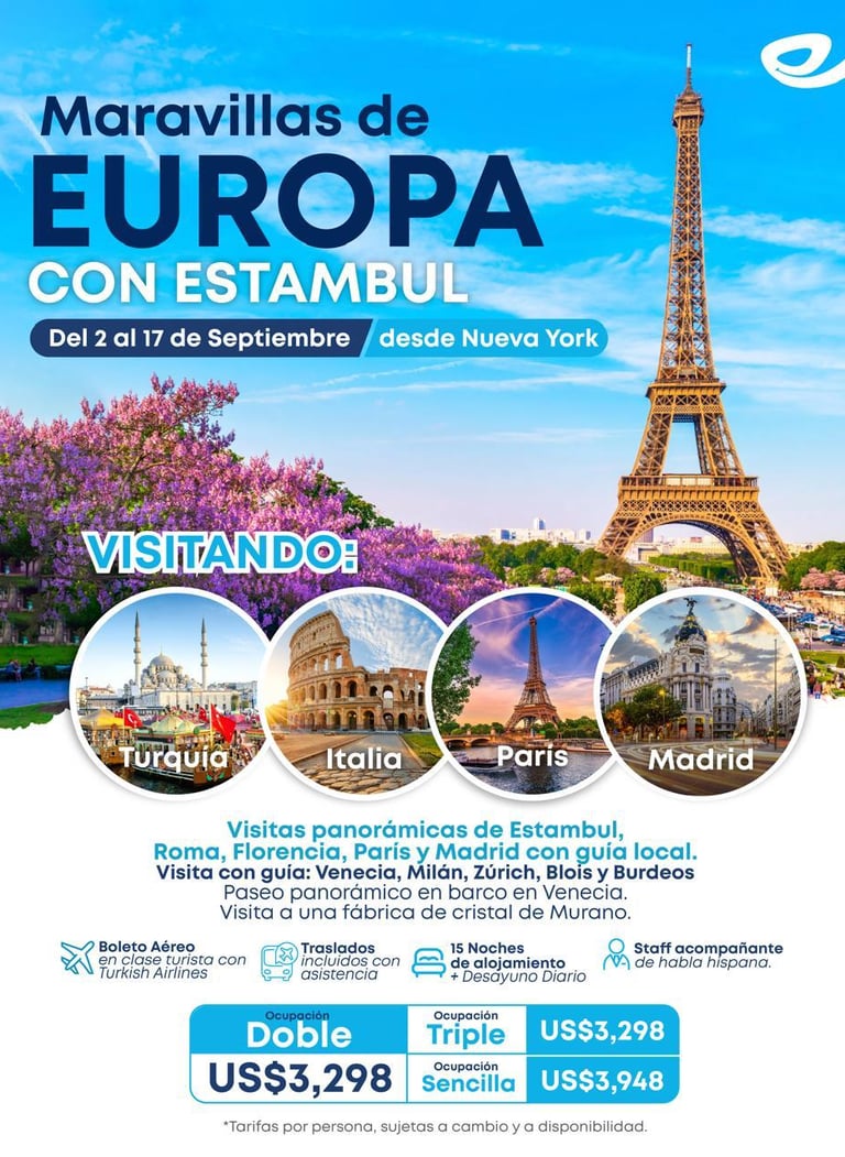 ¡Descubre las maravillas de Europa en un viaje lleno de cultura, historia y belleza! Este recorrido te llevará a explorar algunos de los destinos más emblemáticos del continente, incluyendo Turquía, Italia, Francia y España. Desde la esplendorosa Estambul hasta las ciudades clásicas de Roma, Florencia, París y Madrid, este tour combina lo mejor de Europa en un solo viaje.