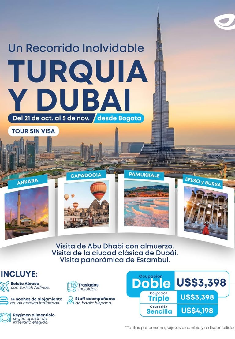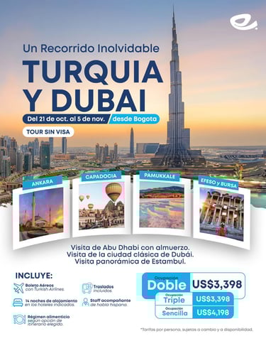 ¡Descubre la magia de Turquía y Dubái en un viaje inolvidable del 21 de octubre al 5 de noviembre! Este tour sin visa te llevará a explorar las maravillas culturales, históricas y naturales de dos destinos únicos. Desde las ciudades clásicas de Estambul y Ankara hasta las impresionantes vistas de Capadocia y Pamukkale, este recorrido combina lo mejor de ambos mundos.